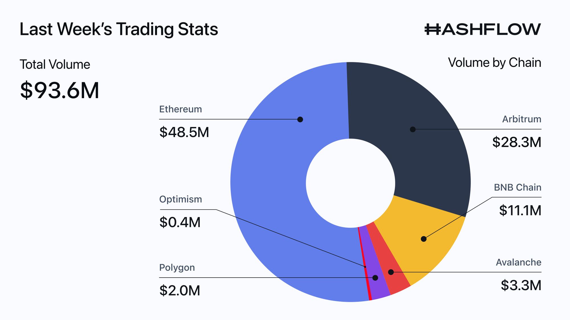 Last week, overall volume stayed above $93M. No surprise, the big three are at it again while the gap between Ethereum and Arbitrum narrowed. Will the Arbinauts (💙,🧡) finally take the crown soon? 👀