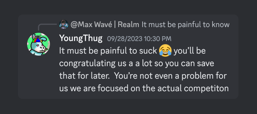 Since the start of Battle #1, this Thug has been showing up on our #🥊Smack-talk Discord channel and CT. If there’s nothing else you take away from this, here it is: don’t mess with the Young Thug 👇