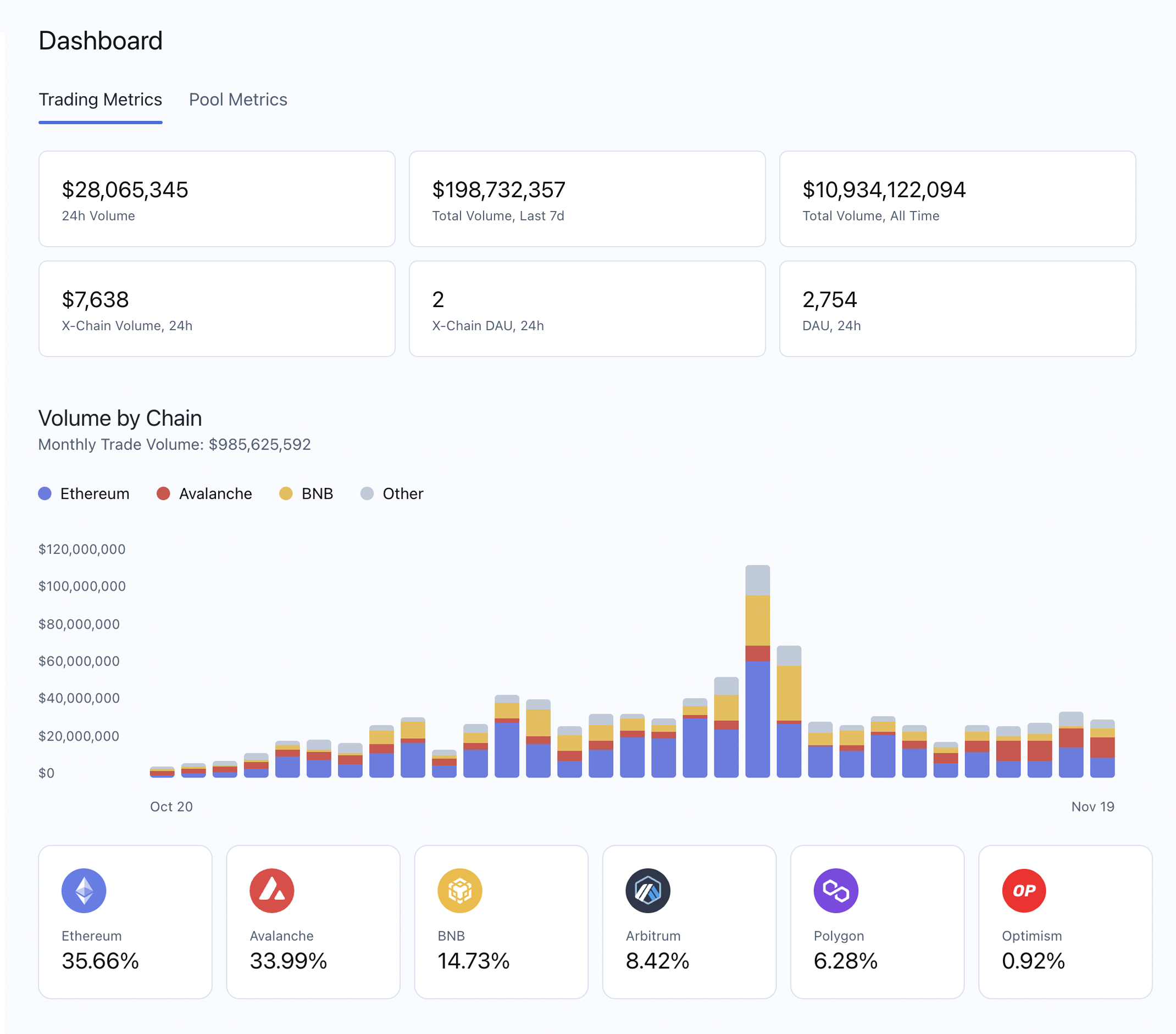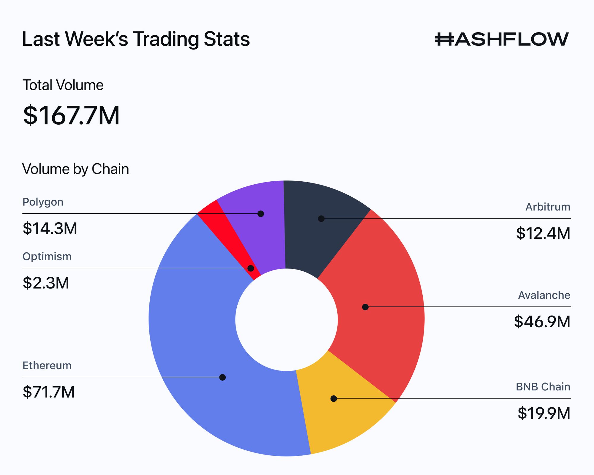 Speaking of metrics, last week’s volume topped nearly $167.7M, with Ethereum mainnet still dominating and Avalanche in the runner-up: